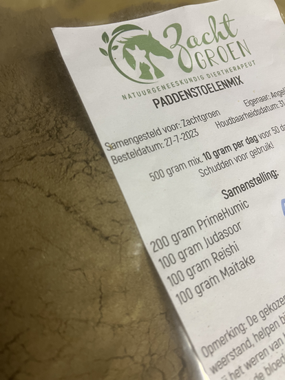 Deze paddenstoelenmix heeft als drager PrimeHumic humuszuren gecombineerd met 1, 2 of 3 soorten paddenstoelen naar keuze van de pony of het paard. De hoeveelheid van de kruidenmix is voor 50 dagen en is op maat gemeten en gemixt.